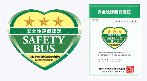 安全送迎に対する取り組みを認められる形で、2012年度より優良事業者として認定を受けており、2016年度には「貸切バス事業者安全性評価認定制度」で最高ランクとなる三ツ星認定を獲得しました。