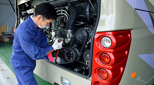 トラック・バス車両にも豊富な知識と実績を有した整備士たちが、日々の安全運行を支えています。